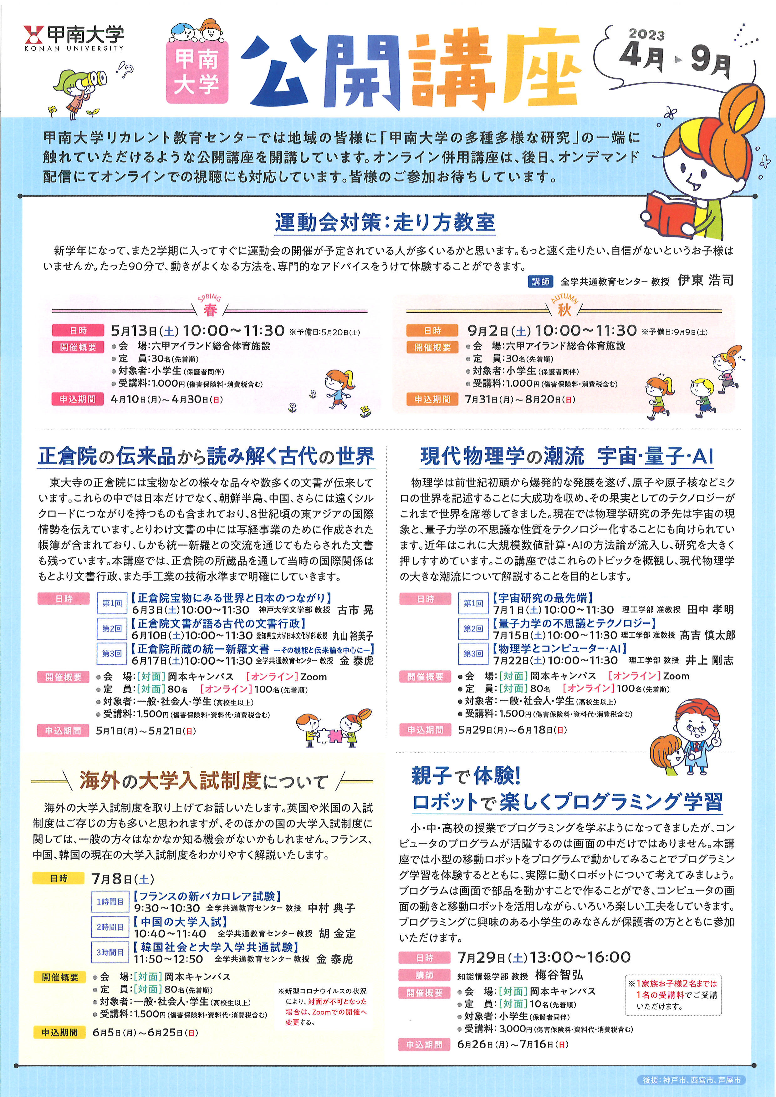 甲南大学リカレント教育センターのホームページにある申込フォームまたは、ハガキにてお申込みください。 ※ホームページは、5月29日(月)午前10時受付開始 【対面】80名 【オンライン】100名 先着順で定員になり次第締め切り |