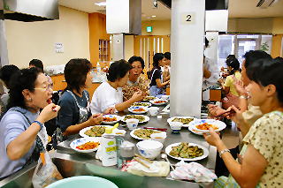 | 流行の韓流ブームに乗って、毎回韓国料理を教えていただきながら、韓国の文化を知っていく異文化交流。1回目は簡単な家庭料理のチヂミやトッポギの調理実習と、ハングル語表を基に自分の名前を書いてみたり、自己紹介の仕方や簡単な挨拶など教えていただきました。 支部長を筆頭にハングル語を習いに行っている人もいるので、参加者同士で教え合う姿もあちこちで見られました。韓国旅行の写真を持参した参加者もいて、特に俳優の話になると花が咲き乱れ!?目が輝いていましたよ。 |