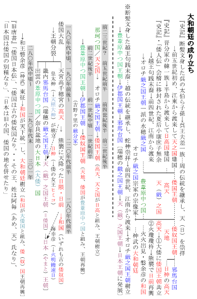 一八五年、日向を発った東征軍が十数年後に日本朝を倒し、辛酉年(四〇一年)元旦に大和朝廷を開いた。