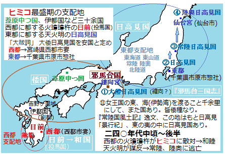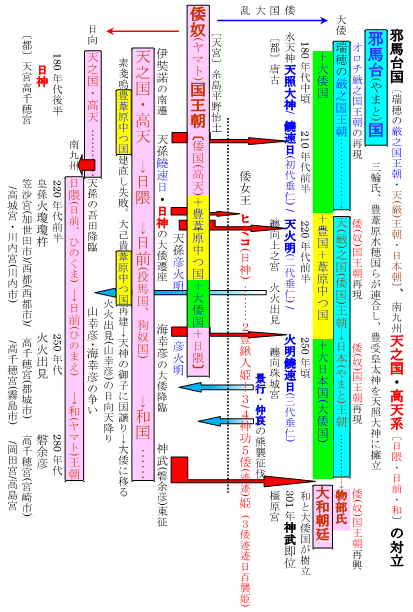 一八〇年代中頃、出雲で天下分け目の決戦に敗れた倭奴国王朝は、南九州の高天〔日高と天之国〓倭、日前、和(ヤマト)〕と畿内邪馬台国