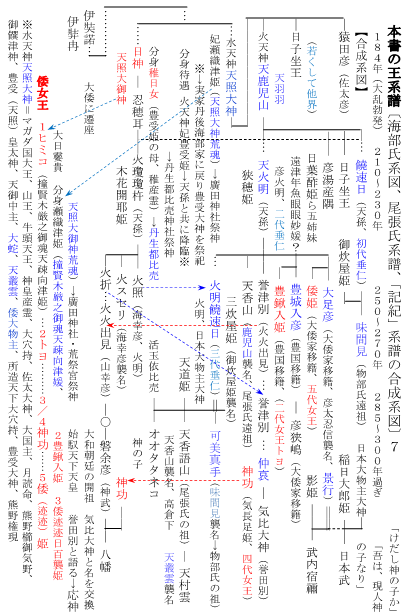 本書の王系譜は、これを本来の姿に正したもので、国宝に指定された海部氏系図と合致します。これに沿って事跡を並べ替えると、一世紀前半に始まる