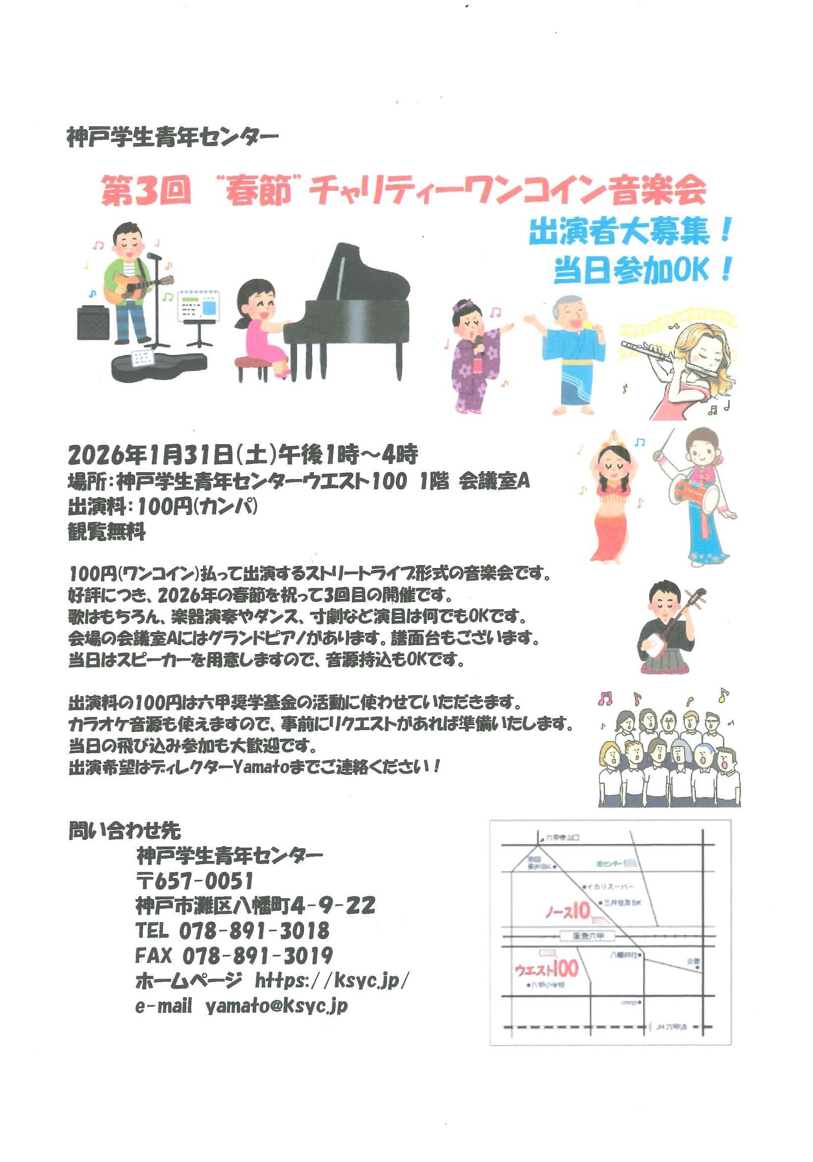 大好評で第3回の開催になりました。軽飲食持ち込みもオッケーですので、音楽を演奏したり、音楽を聴いたりみんなで楽しみましょう!出演料100円は六甲奨学基金に寄付されます。ぜひふるってご参加ください。